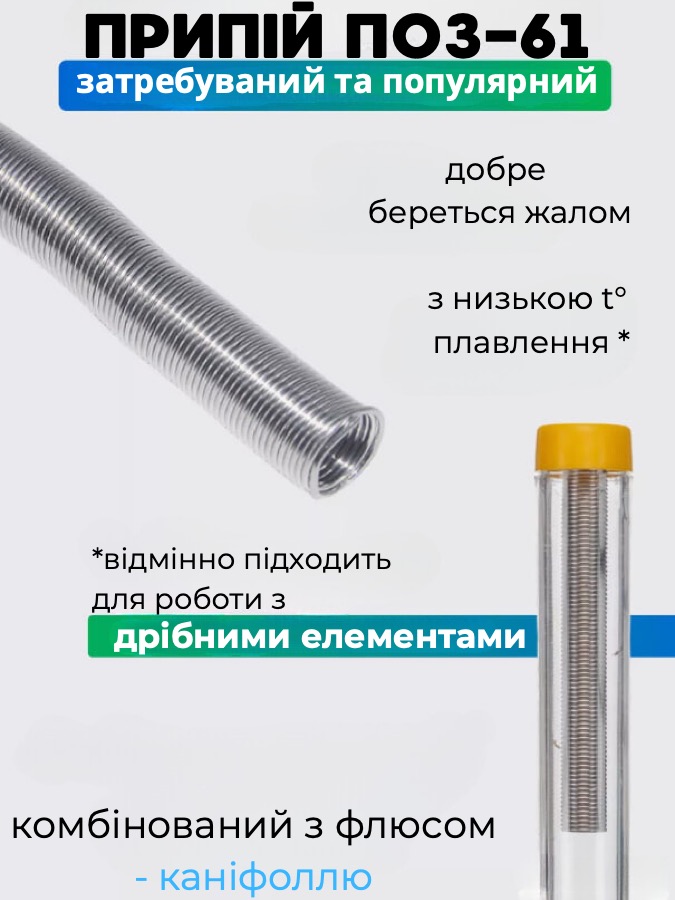 - Канифоль для поліпшення якості пайки та захисту від окислення.