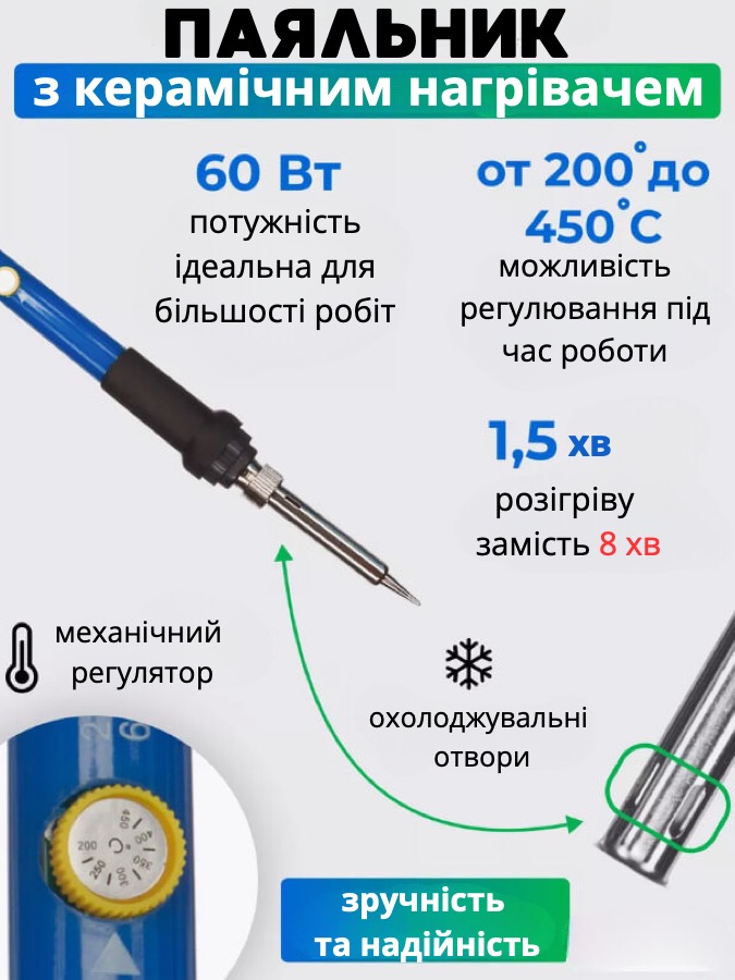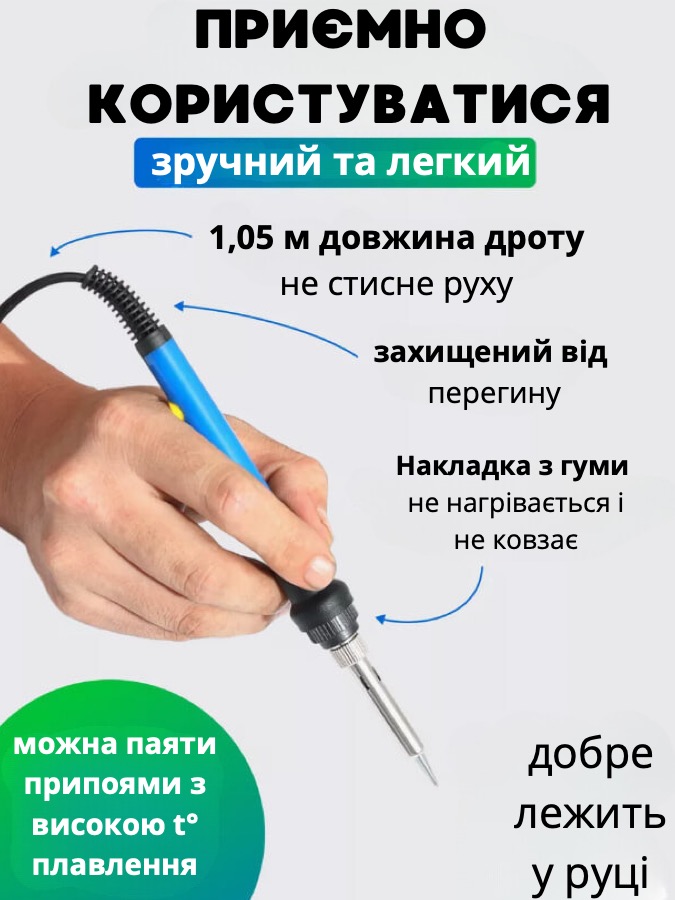 - Матеріал відсмоктувача для припою: алюміній, пластик