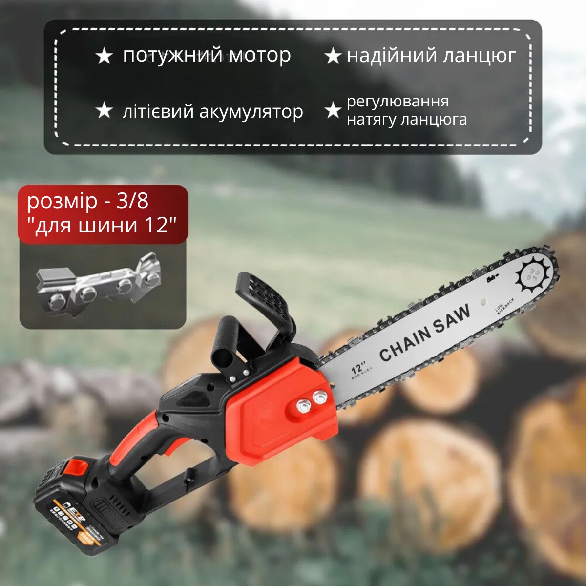 Акумуляторна пила має легку вагу і зручно розміщується в руці. Практична, швидка, з плавним пуском ланцюгова міні-електропила стане незамінним помічником на присадибній ділянці та на дачі!