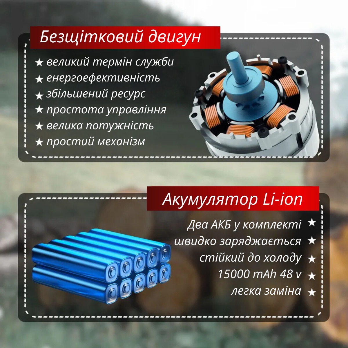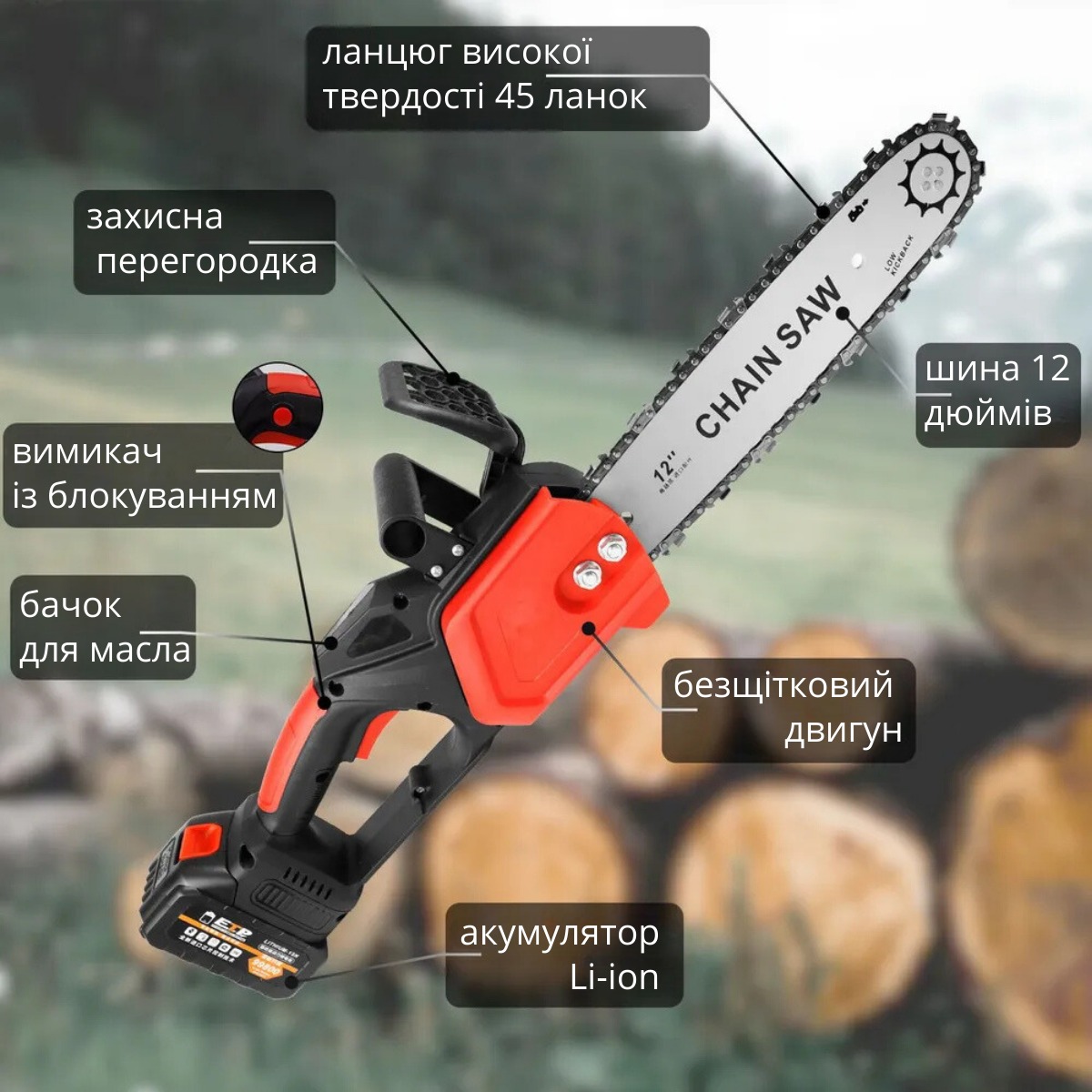 | Найменування товару | Акумуляторна ланцюгова пила 12 дюймів з двома акумуляторами в кейсі 48 V |