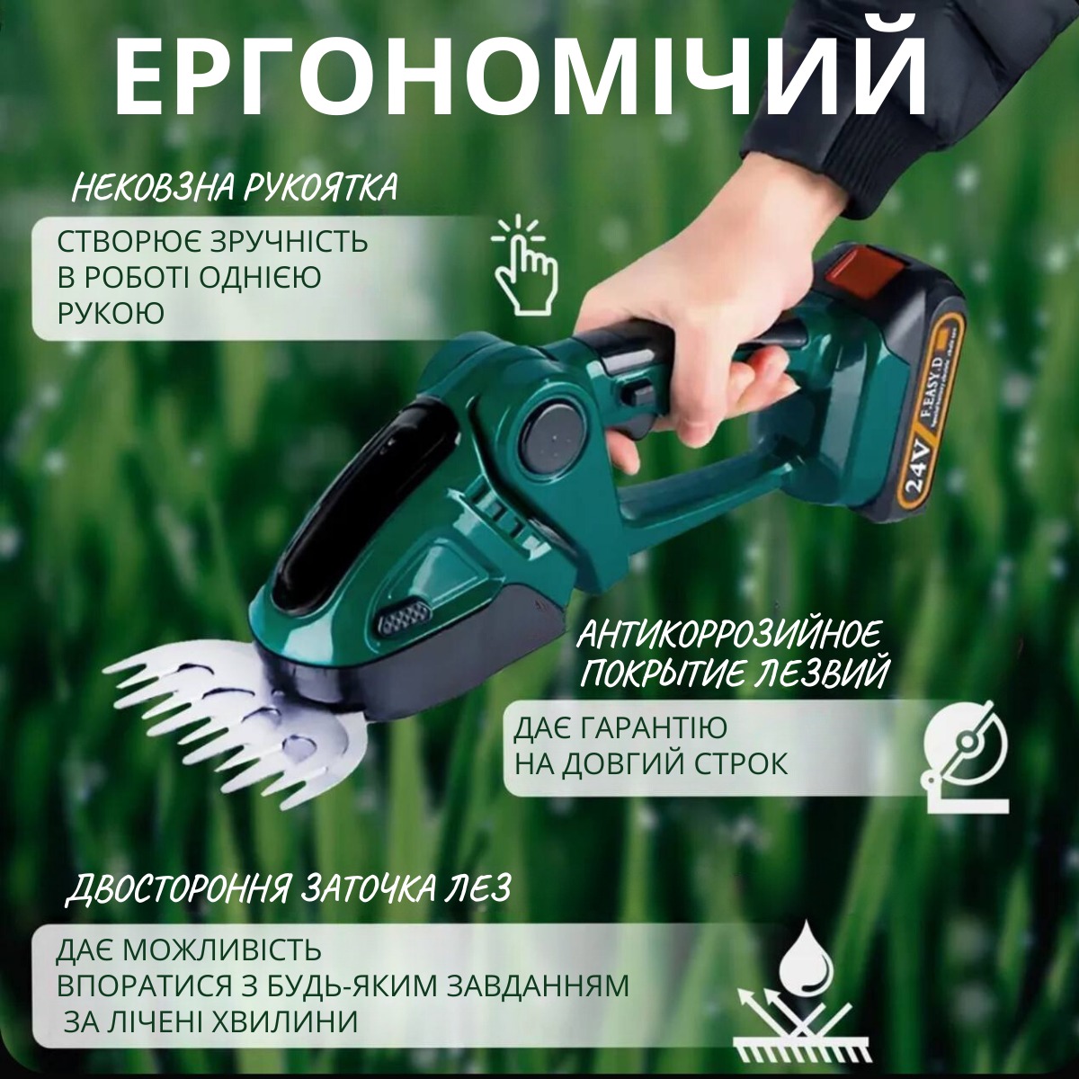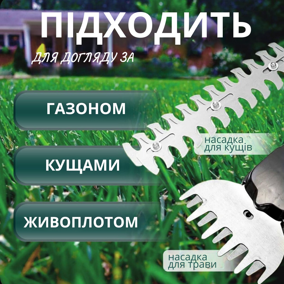- - Універсальність: підходить для стрижки різних видів рослин — від трави до густих кущів.