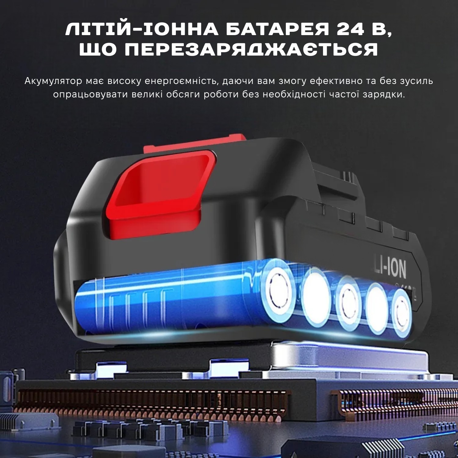 Акумуляторна пила - це потужний пристрій оснащений 24-вольтним акумулятором, забезпечуючи надійну та ефективну роботу тривалий час.