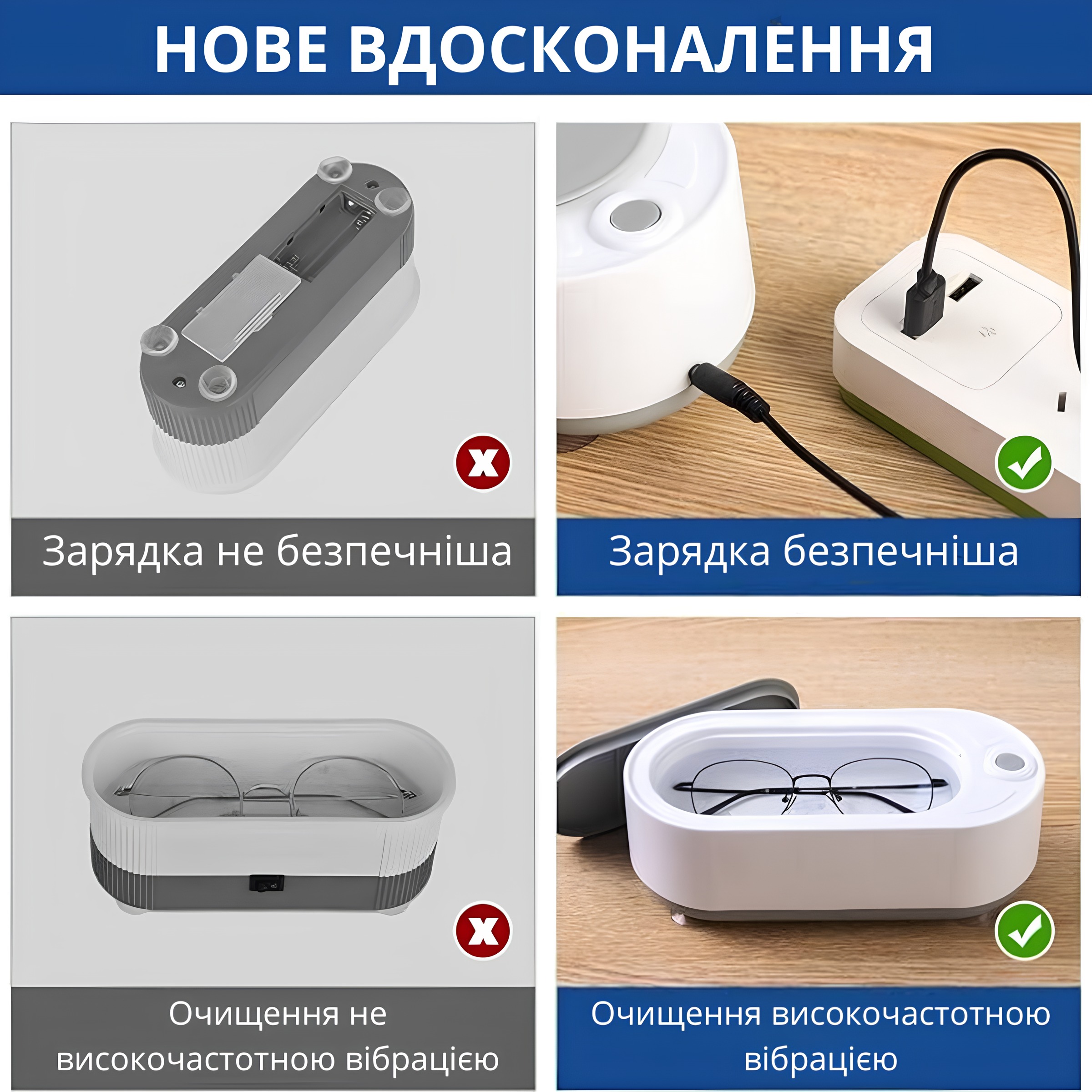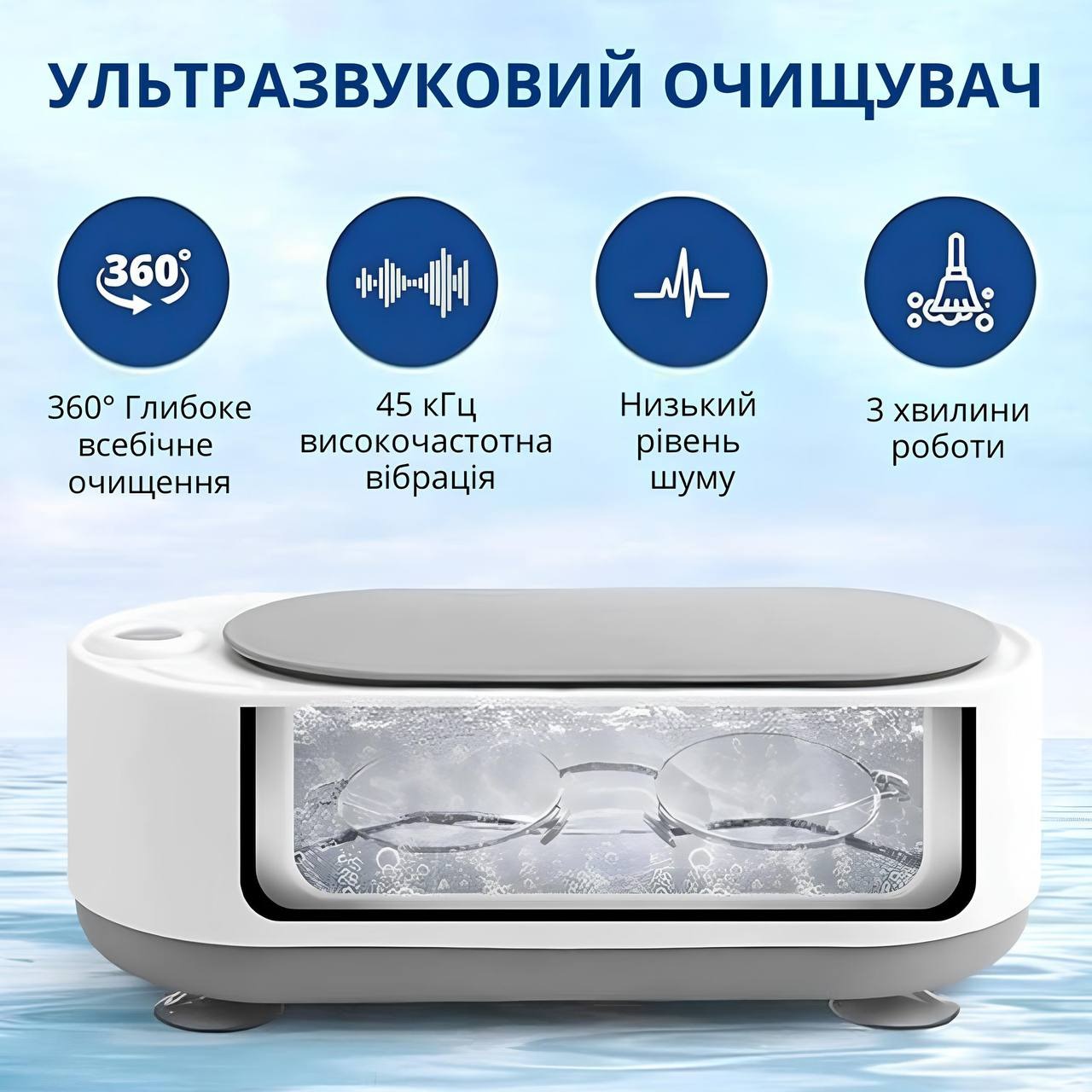 | Особливості | Швидке ультразвукове очищення, повне очищення у важкодоступних місцях, портативність |
