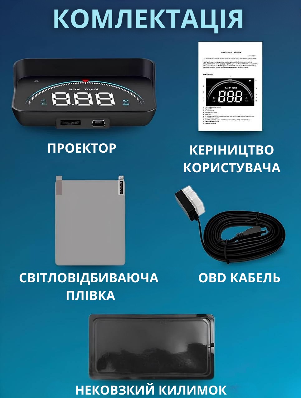 | Комплектація | Дисплей, кабель OBD2 — Mini USB, антиковзаючий килимок, плівка на лобове скло, інструкція англійською мовою |