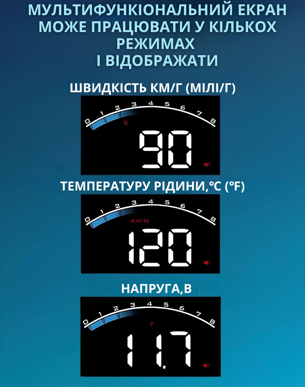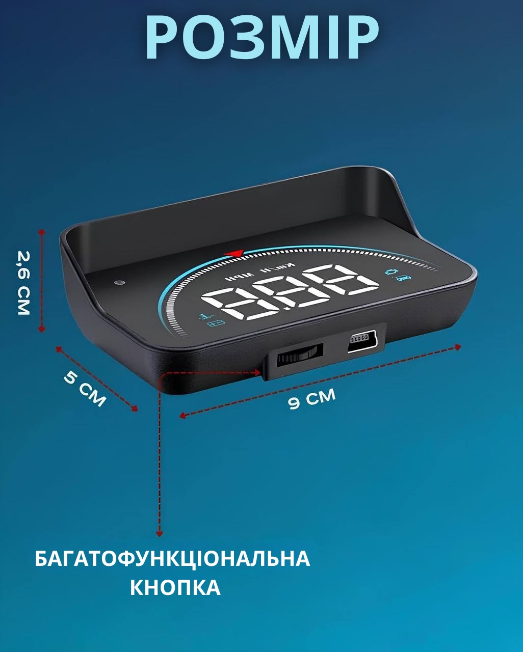 Можливість індивідуального налаштування: яскравість, розмір зображення та інші параметри можна налаштувати під себе.Стильний проекційний дисплей на лобове скло автомобіля. Дозволяє не відволікаючись від дороги побачити поточну швидкість, витрату пального, а також інші важливі характеристики. Розмір проектованого зображення близько 3.5».